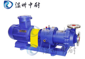 高温磁力驱动离心泵(简称高温磁力泵)通常由电机,磁力偶合器,水冷却装置和耐腐蚀离心泵四大部分组成,其主要特点是利用磁力偶合器传递动力。当电动机带动磁力偶合器的外磁钢旋转时,磁力线穿过间隙和隔离套,作用于内磁钢上,使泵转子与电动机同步旋转,无机械接触地传递扭矩。在泵的动力输入端,由于液体被封闭在静止的隔离套内,没有动密封因而无泄漏。磁力偶合器的磁性材料采用耐高温型稀土永磁材料,能承受280度以下的高温介质而保持强大的磁力扭矩。在电机与磁力偶合器之间加装了水冷却装置,防止泵送高温介质之热量传导至电机,以保持电机的正常运行,从而达到无泄漏输送高温介质。