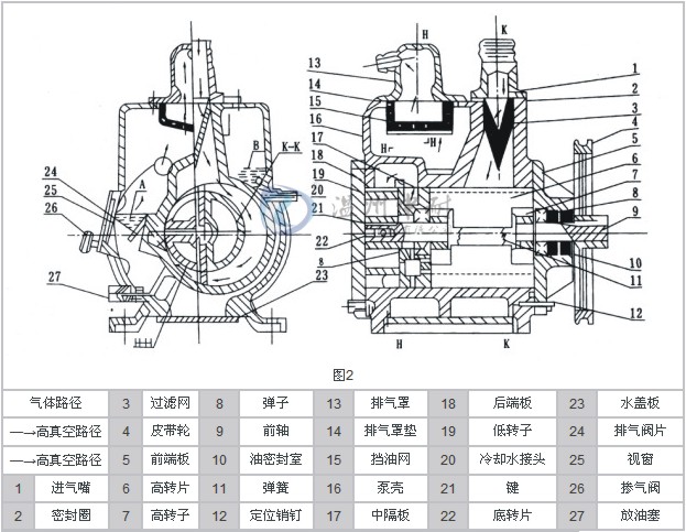 抽气过程:见图2,气体由进气嘴进入高真空室,起初是高压强,高低真空室都充满大气,两个排气门都打开排气。随着抽气的进行,气压下降(即真空度提高),高真空室压力不足以推开排气门,气体经中隔板而进入低真空室,此时压力亦不足推开排气门,但低真空室进入有一定量油,帮助推开排气门,气体亦随之排出。排出的气体夹杂着的油粒,经挡油网过滤而使油分离,只有气体排出泵外,气体路径见图2。油密封室里的油,由油池A经前端板上的孔供给。低真空室里的油,由油池A经后端板上的孔供给。高真空室的油,由中隔板上的孔,循环供给。前后端盖的密封是由泵体上部的油池B经泵体端面室的孔而流入油槽进行密封的。